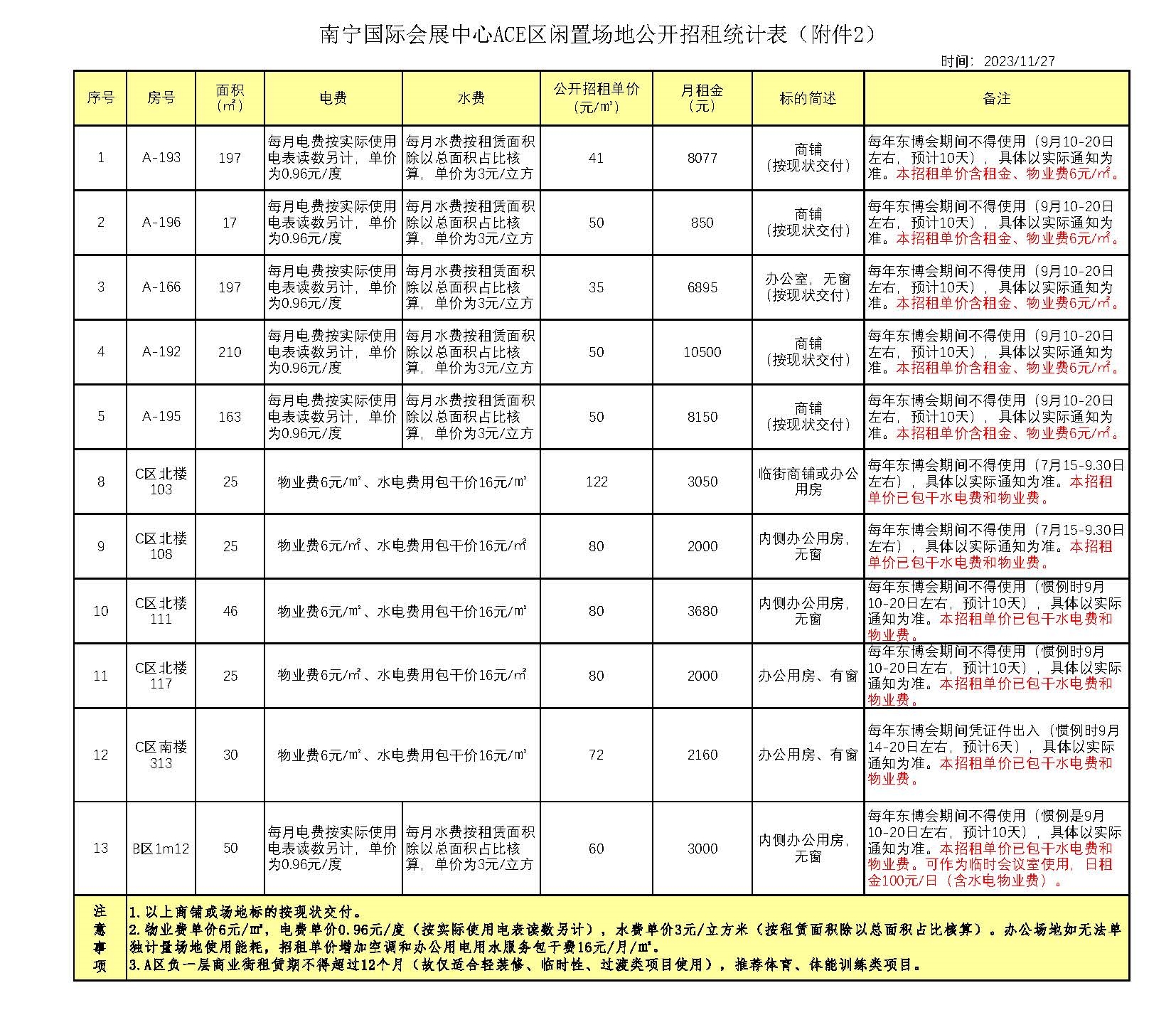 附件一、南宁国际会展中心ABC区闲置场地公开招租统计表