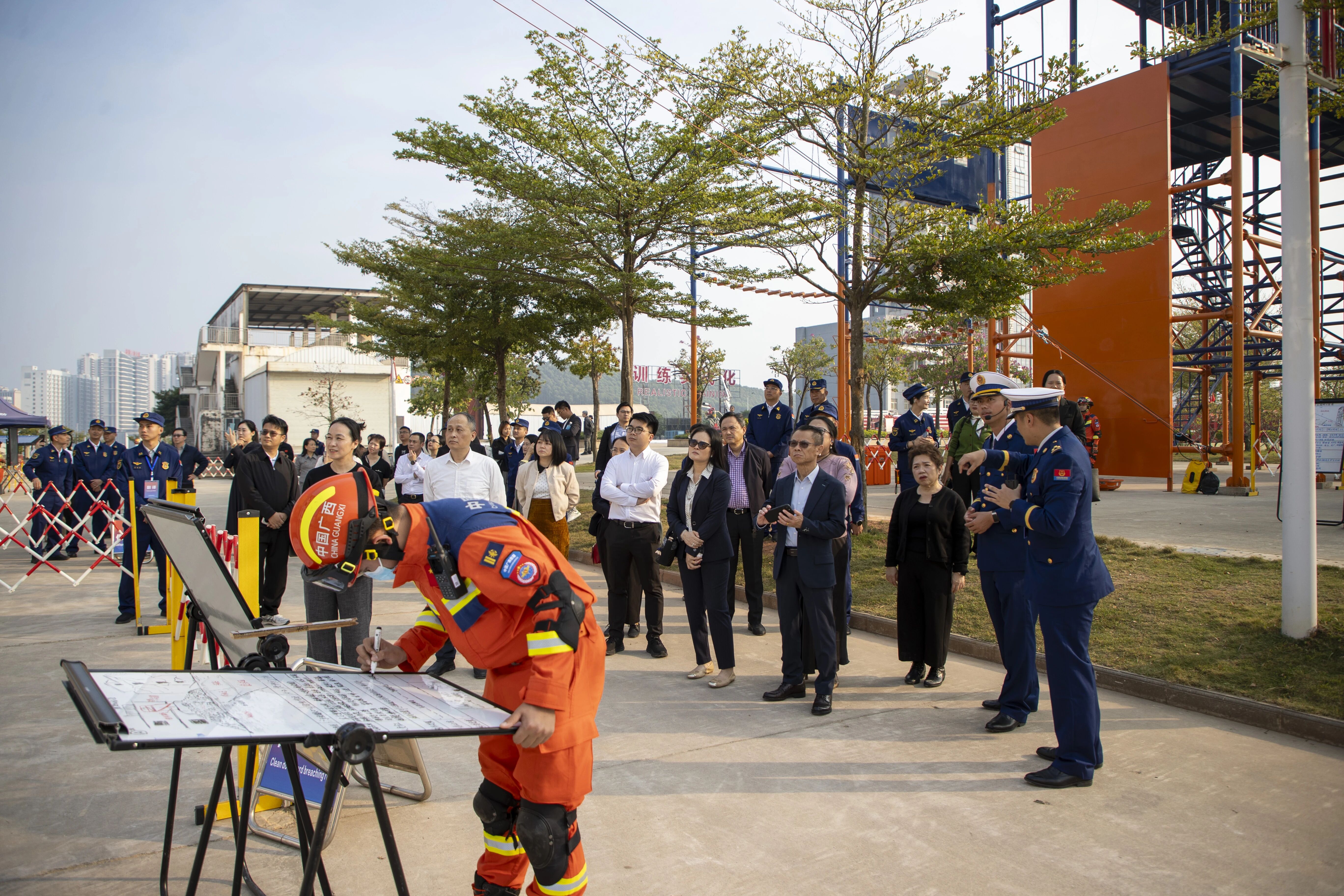 在广西壮族自治区消防救援总队南宁训练基地,代表团实地观摩了人工智能技术在应急救援领域的深度应用。多级扩展方舱消防指挥车、智能救援装备管理系统等先进装备,体现了指挥调度的集成化与智能化。代表们对各类救援装备充满好奇,纷纷登车了解更多细节,与现场指战员交流救援装备的实际应用,还观看了无人机水炮和消防机器人灭火、无人机探查救援现场、水下救援演练等项目的实操演示,直观感受了人工智能如何提升救援的精准性、效率与安全性,这些前沿应用为双方拓展跨国应急救援合作与技术交流提供了新的思路。
