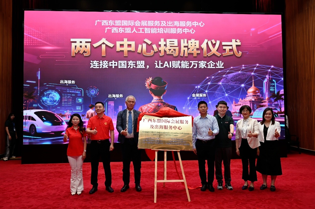 南宁国际会展中心有限公司有关负责人和各发起单位代表共同为“广西东盟人工智能培训服务中心”和“广西东盟国际会展服务及出海服务中心”揭牌。这两大中心由南宁国际会展中心有限公司发起组建,将汇聚政策、技术与经验,为广西企业出海提供AI培训、咨询服务及人才支撑、市场调研、会展服务等全流程支持,推动广西企业出海服务体系全面升级。